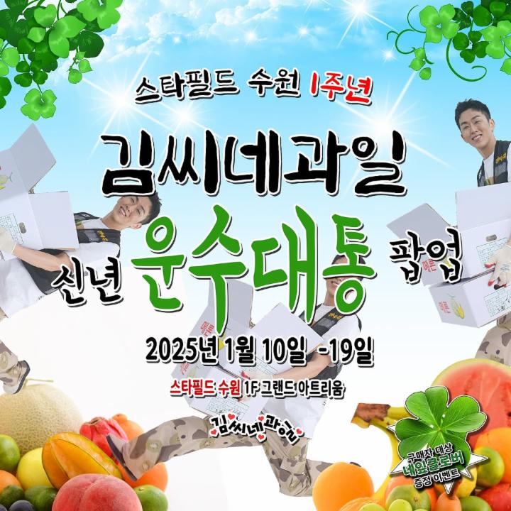 정보겨울에도 핫한 과일 가게, 김씨네 과일 팝업이 수원 스타필드에 찾아옵니다!🍑 행운이 팡팡 터지는 이번 팝업에 방문해 내가 좋아하는 과일 티셔츠도 득템하고 행운을 불러주는 네잎클로버도 받아가세요🍀📷 instagram @kimsfruits, starfield.official