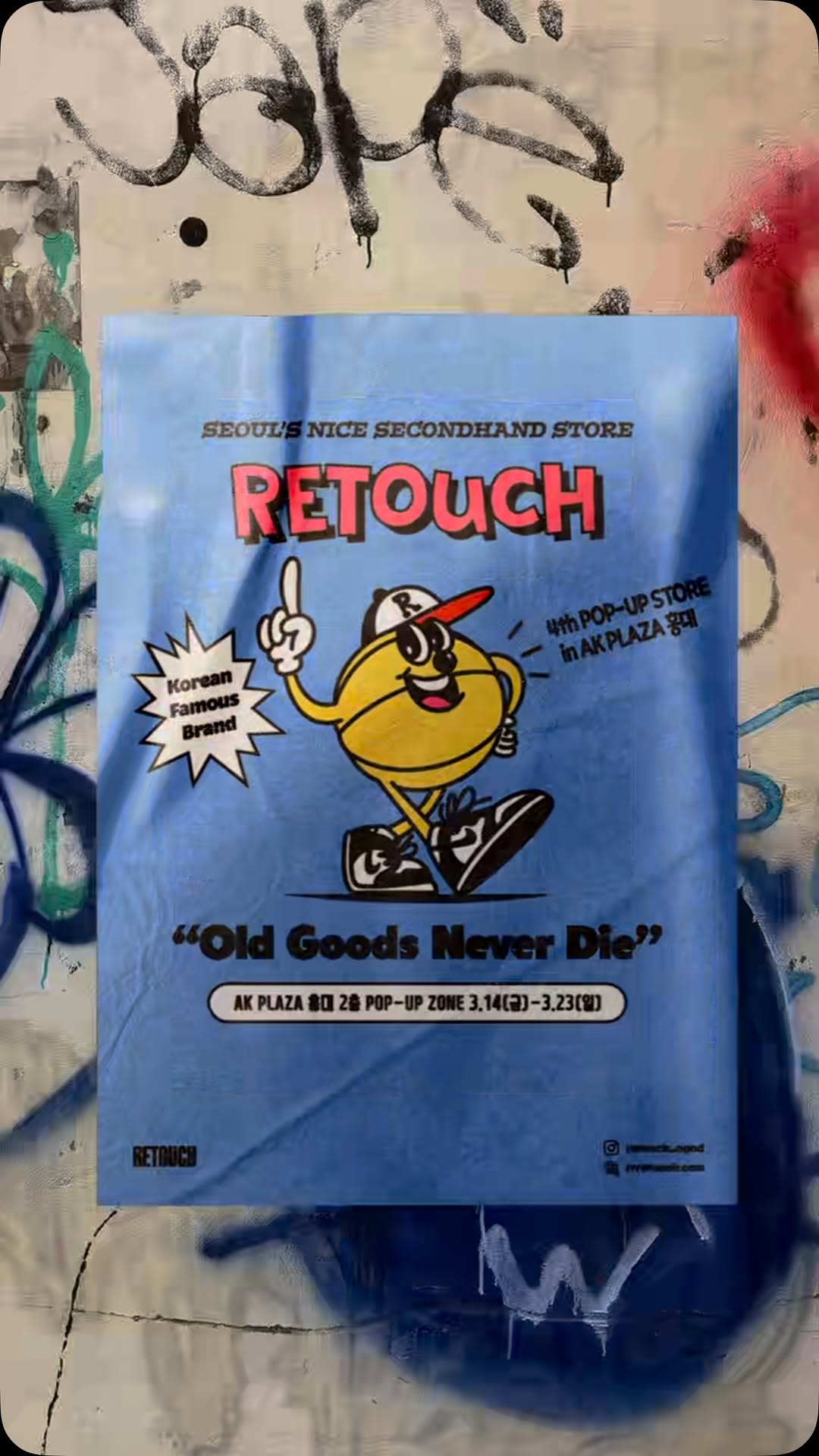 정보리터치 팝업 스토어를 홍대 AK플라자에서 오픈합니다‼️ 봄, 여름 아이템은 물론 이번 팝업에서 특별히 선보이는 Korean Famous Brand들의 세컨핸즈 제품도 할인가로 만나보세요!🛍📷 instagram @retouch_ognd