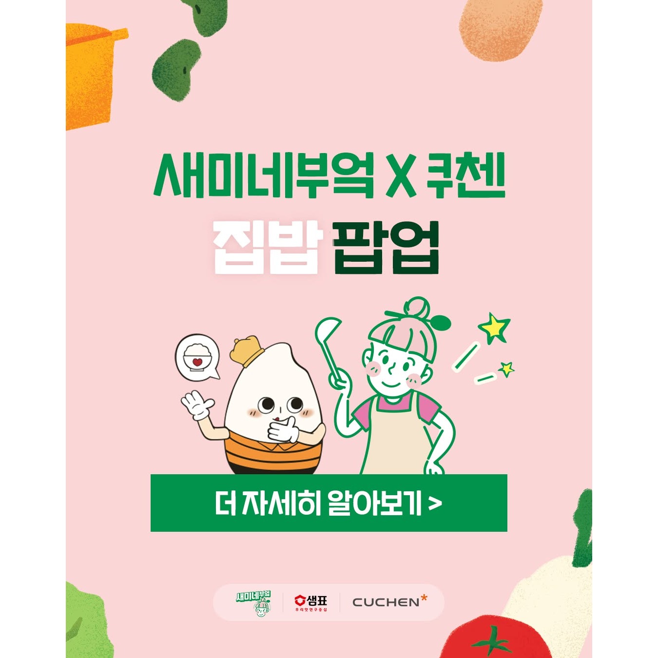 정보집밥이 주는 힘을 잊지 않고 더 간편하고 건강하고 이로운 요리를 연구하는 새미네부엌과 쿠첸이 '집밥' 팝업을 오픈합니다.🍚 밥, 반찬, 요리에 대한 모든 정보를 확인하고, 집밥 요리를 직접 만들고 가져가세요!🙌📢 집밥 체험 - 하루 5타임 운영 (매 회 20명, 선착순 사전 예약) 📷 instagram @cuchen_kr