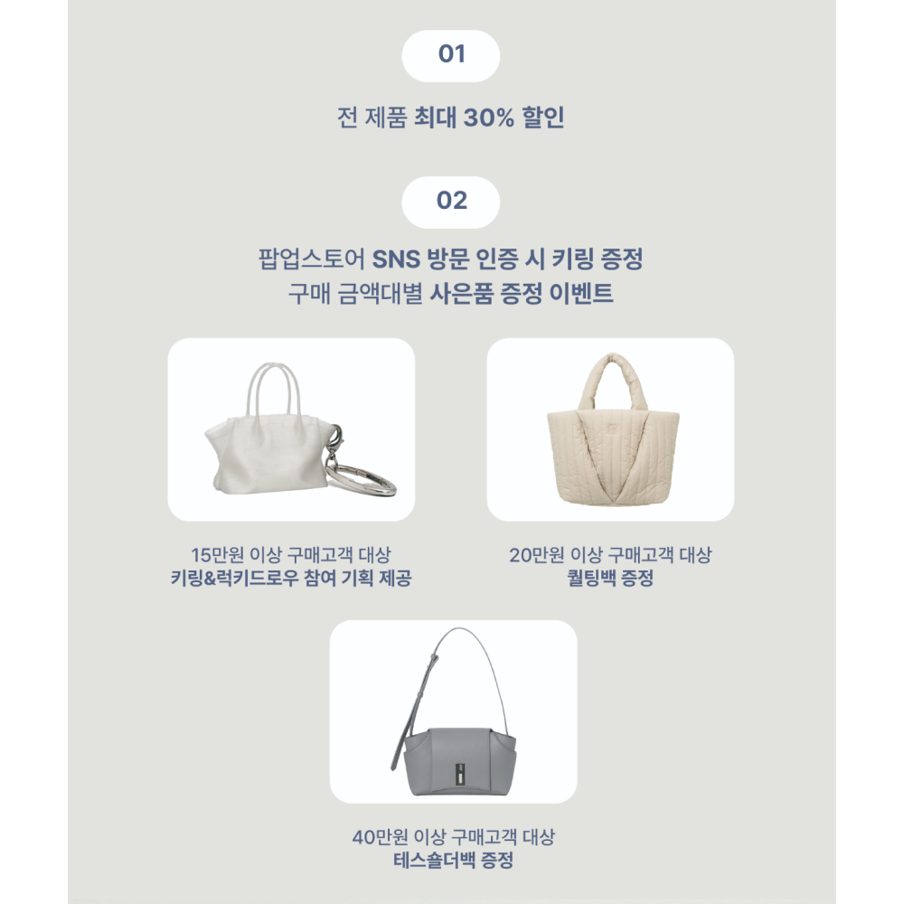 혜택현장 이벤트💌 전 제품 최대 30% 할인 💌 15만 원 이상 구매 시, 키링 & 럭키드로우 참여 기회 제공 💌 20만 원 이상 구매 시, 퀼팅백 증정 💌 40만 원 이상 구매 시, 테스숄더백 증정