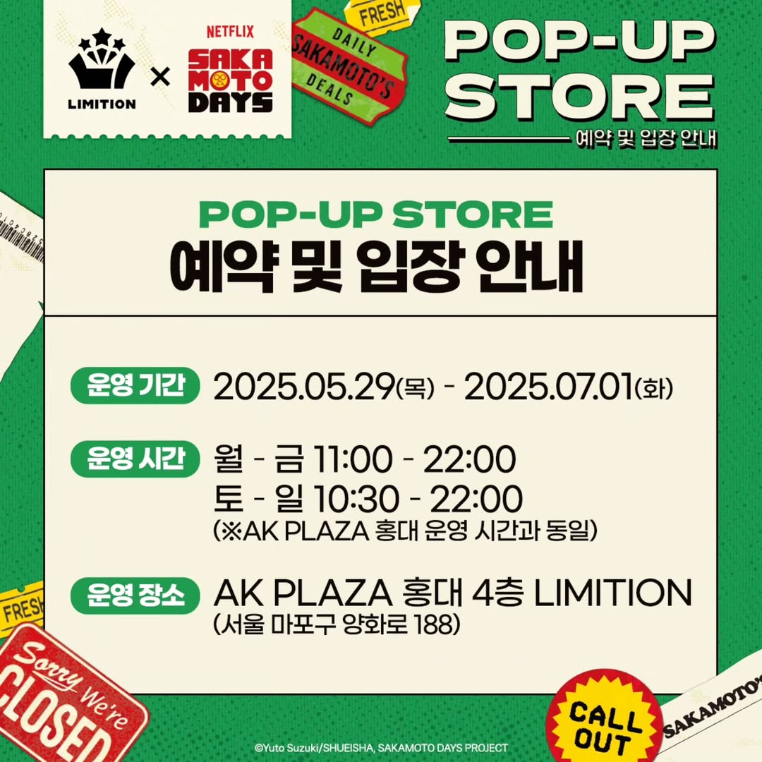 정보은퇴한 전설의 킬러, 팝업으로 한국 상륙?💥 사카모토 데이즈 팝업 스토어가 AK PLAZA 홍대에 오픈합니다.🔫 사카모토 데이즈의 스타일리시함을 담은 오리지널 굿즈를 팝업 현장에서 만나보세요!🔥📢 사전 예약 오픈 : 5.22(목) 18:00 📢 사전 예약 운영 기간 : 5.29(목) ~ 6.1(일) 📢 사전 예약 기간 이후 6.2(월)부터는 현장 자율 입장으로 진행됩니다. 📷 instagram @limition_pick