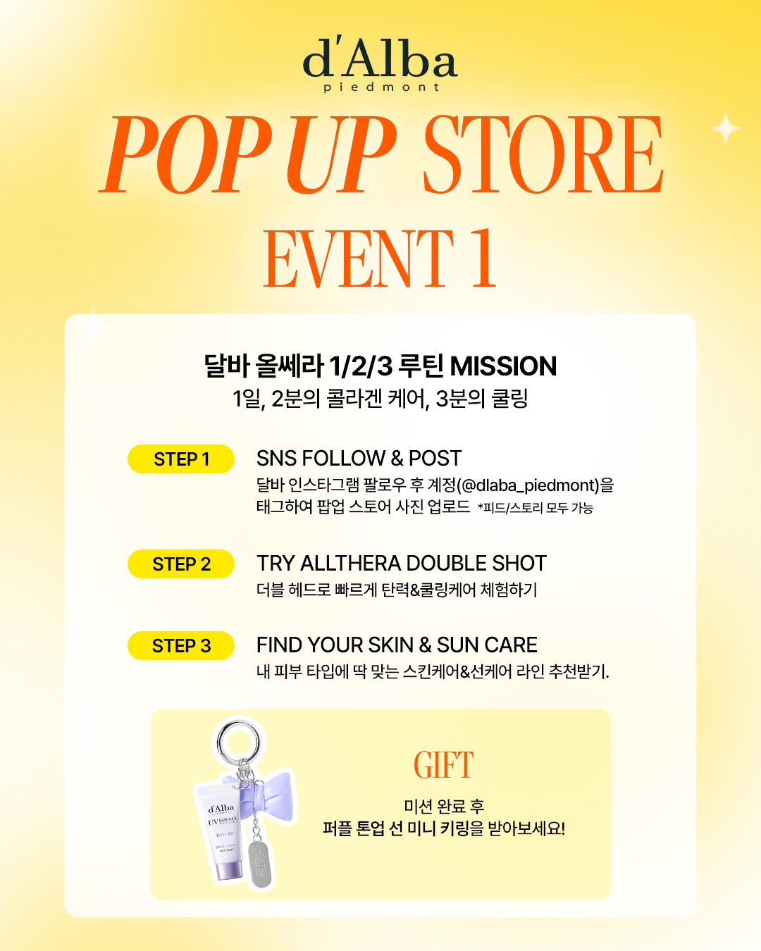 💌 올쎄라 1/2/3 루틴 MISSION 완료 시, 미니 퍼플 톤업 선크림 키링 증정