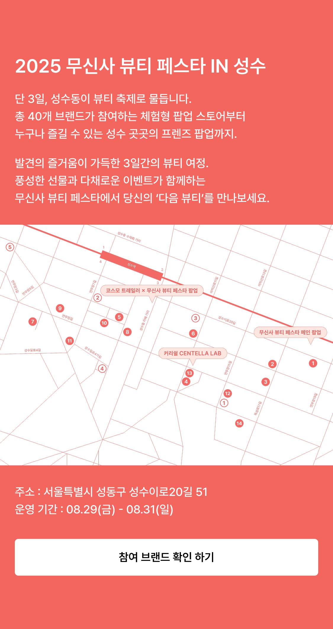 📢 티켓 예매 안내 - 얼리버드 티켓 예매 : 08.22(금) 11:00 - 일반 티켓 판매 : 08.25(월) 11:00 📢 '브랜드와 직접 만나는 순간' 클래스 소개 - 오드타입 : 8월 29일 (금) / 1부-11:00 2부-14:00 3부-17:00 / 오드타입과 함께하는 퍼스널 진단 - 클리어디어 : 8월 30일 (토) / 1부-11:00 2부-14:00 3부-17:00 / 인플루언서 지요미님과 함께하는 피부 고민 상담 - 에스네이처 : 8월 30일 (토) / 1부-12:00 2부-15:00 3부-18:00 / 유튜버 관하살 밋업, 배쓰솔트 체험 클래스 - 리필드 : 8월 31일 (일) / 1부-11:00 2부-14:00 3부-17:00 / 두피&페이스 괄사 클래스 📢 모든 클래스는 사전 예약 후 참여 가능합니다. (티켓 구매 시 옵션 선택) 📢 각 매장, 클래스 별 운영시간을 확인해주세요.