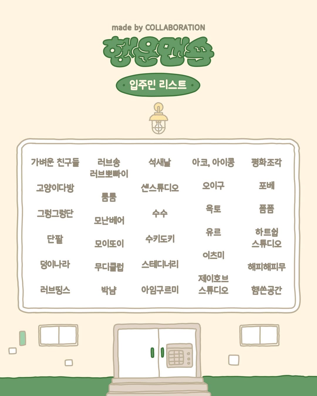 📢 참여 브랜드 - 가벼운 친구들, 고양이다방, 그렁그렁단, 단팥, 덩이나라, 러브띵스, 러브송러브뽀빠이, 룸룸, 모난베어, 모이또이, 무디클럽, 박냠, 석새날, 센스튜디오, 수수, 수키도키, 스테디너리, 아임구르미, 아코 아이콩, 오이구, 옥토, 유르, 이츠미, 제이호브스튜디오, 평화조각, 포베, 폼폼, 하트쉽 스튜디오, 해피해피무, 햄쓴공간