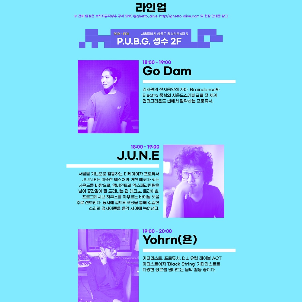 📢 브릿지뮤직성수 유료 티켓은 19일, 21일 이틀간 관람 가능한 2일권 입니다.(단, 19일 21일 각각 다른 손목밴드로 운영) 📢 신분증 지참 필수 📢 20일 토요일은 무료 프로그램으로 손목밴드 없이도 입장 가능합니다. 📢 라인업 및 장소 소개 - 9월 19일 (뮤직스페이스) : Go Dam, J.U.N.E, Yohrn(욘), DizzyMunzzy, THE LWNR, 지베뉴 - 9월 20일 (성수연방) : 배가영의 망고리타, 윤연준, Zoey, 빅직 - 9월 21일 (오브젝티트 스튜디오) : 몽글덤, 삼산, 모허, Soopie, 애니멀 다이버스