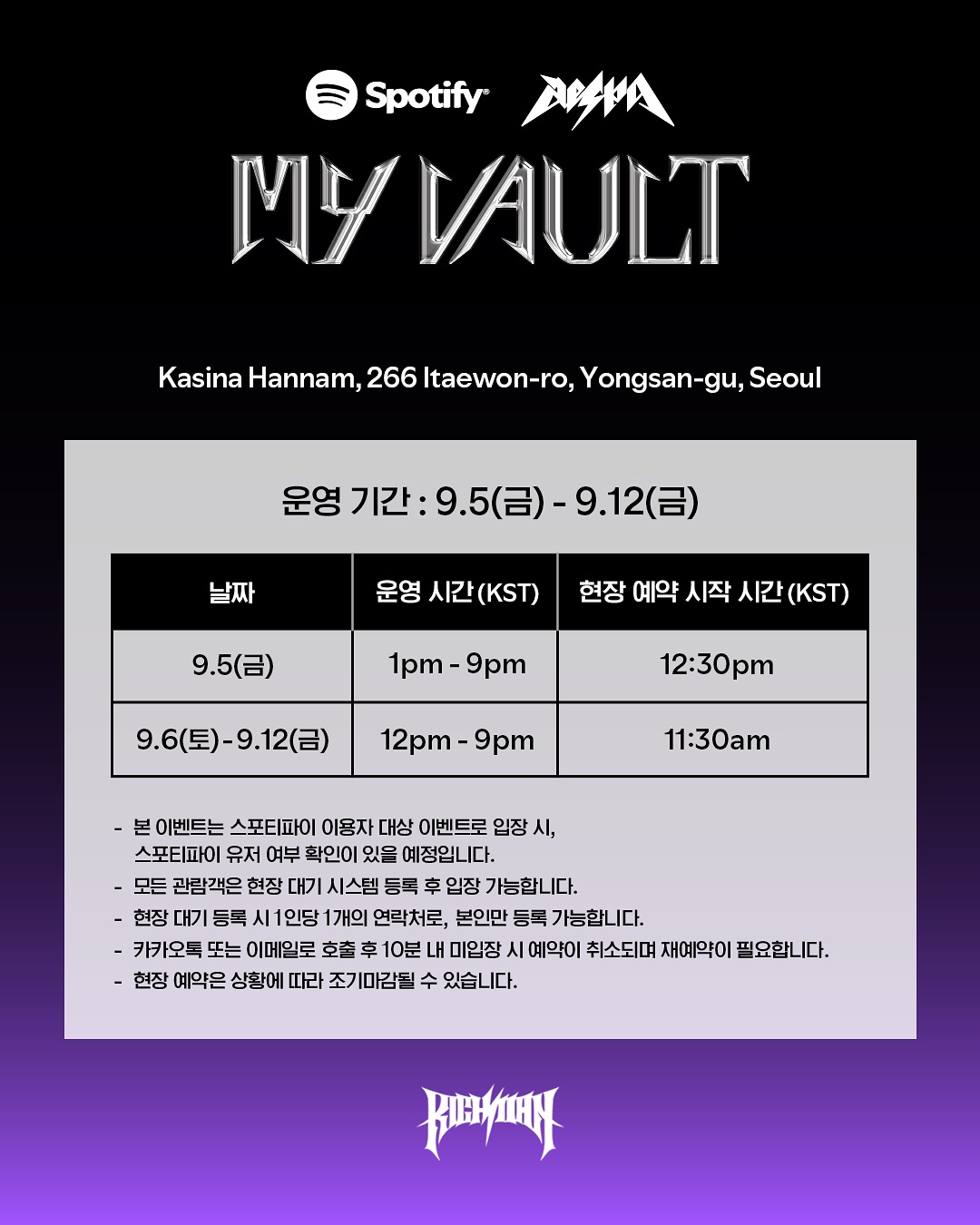 📢 9월 5일 운영시간 : 13:00 ~ 21:00 📢 마이 볼트 팝업스토어는 스포티파이 이용자 대상 이벤트로, 모든 관람객은 현장 대기 시스템 등록 후 입장 가능합니다. 📢 현장 예약 시작 시간 안내 - 9월 5일 : 12시 30분 - 9월 6일 - 12일 : 11시 30분