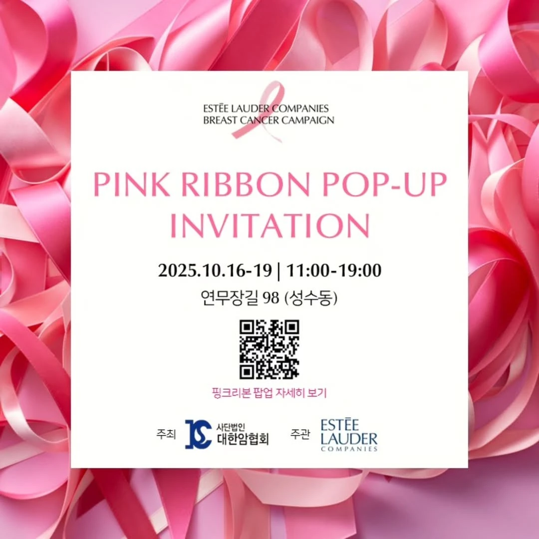 정보유방암 캠페인, 핑크리본 팝업, 올해 성수에서 만나보세요 🎀 유방암/캠페인 정보존, 자가검진 체험, 핑크 퀴즈, 핑크 리미티드 제품 체험을 비롯해 핑크리본 카페, 캐리커쳐, 핑크리본 드로잉 등 다양한 체험과 특별한 포토존까지! 지금, 성수에서 만나보세요 ✨📷 instagram @esteelaudercompanies_kr