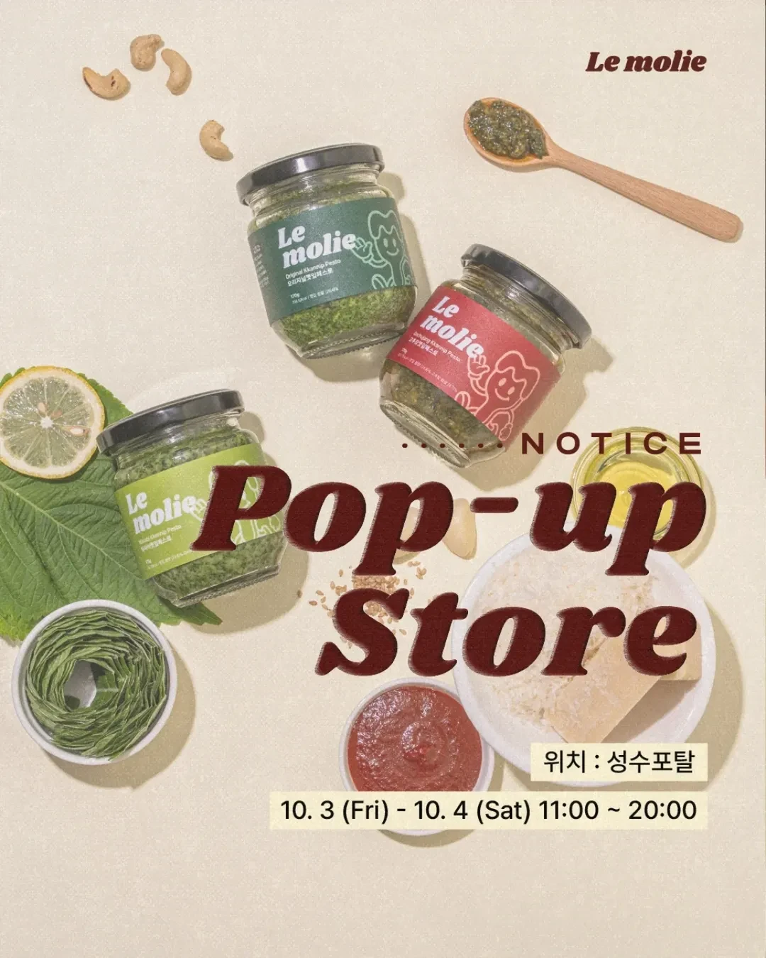 정보경희대생 두 청년이 만든 청춘 F&B 브랜드 몰리가 성수로 찾아갑니다! 금산 깻잎으로 정성껏 만든 깻잎페스토 3종을 직접 맛보고, 특별한 혜택과 함께 만나보실 수 있어요 🍃✨📷 instagram @molie_brand.log