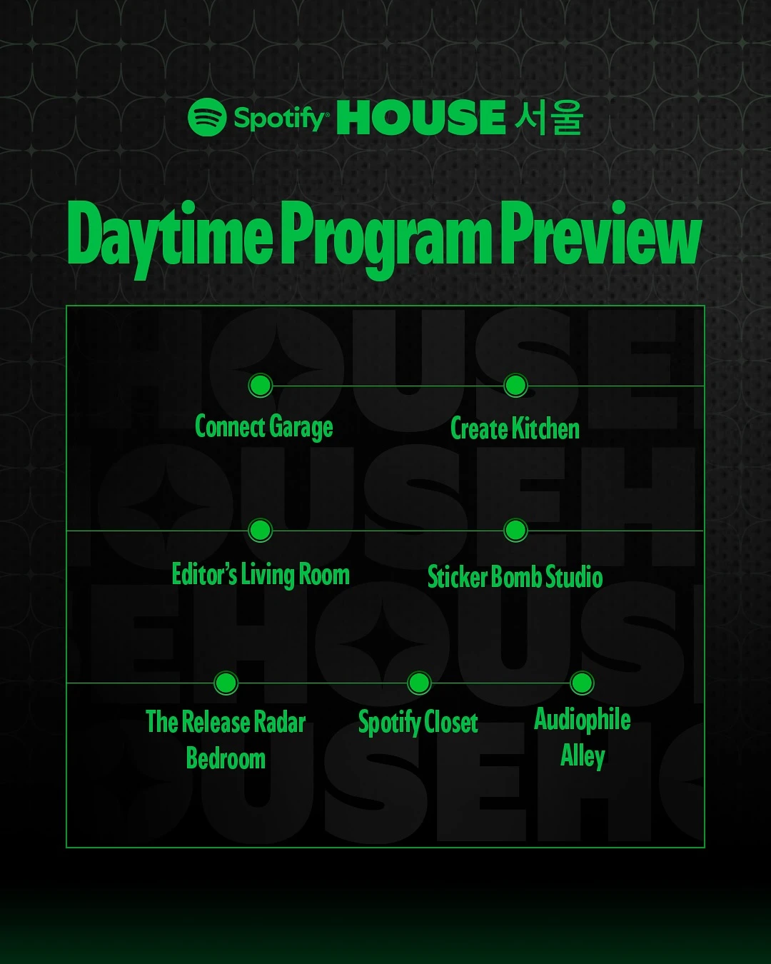 📢 공연 안내 - 일시 : 11월 14일 - 15일 - 시간 : 17시 이후 - 공연 응모 대상 : [Spotify House 서울] 플레이리스트를 SNS에 공유한 스포티파이 프리 & 프리미엄 유저 - 응모 기간 : 11월 3일 - 6일 - 당첨자 발표 : 11월 7일 이후 개별 DM 안내 📢 11월 13일은 INVITATION ONLY 행사로 진행됩니다. 📢 11월 14일 공연 라인업 안내 - Jay Park, LNGSHOT, Zion.T, BIBI, JUNNY 📢 11월 15일 공연 라인업 안내 - 장기하, 이승윤, 카더가든, 한로로 📢 팝업 프로그램은 공연과 별개로 운영됩니다.