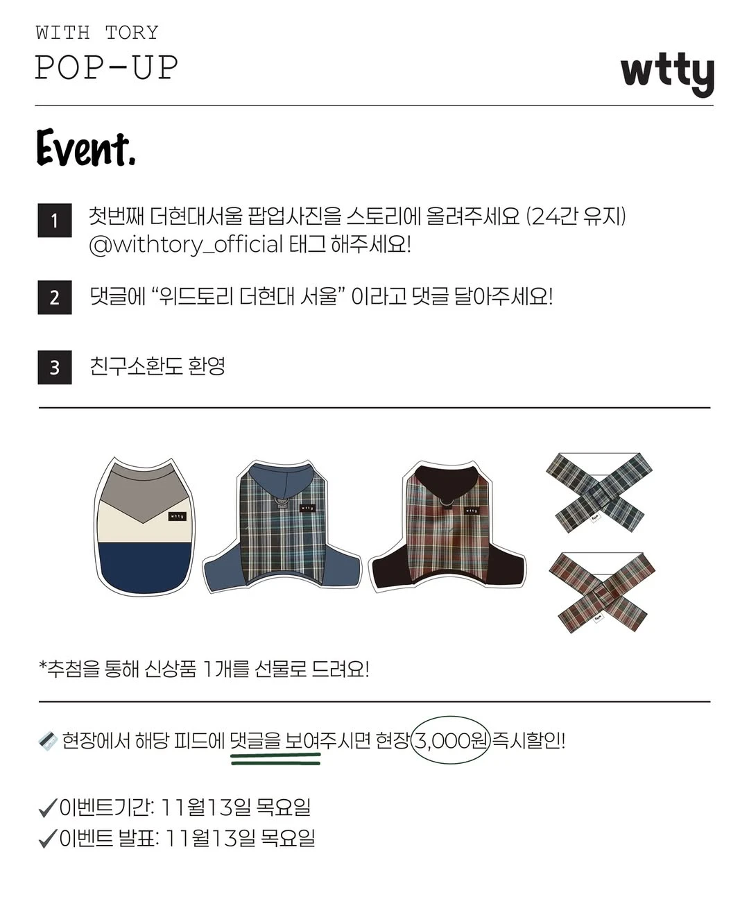 정보사랑스러운 우리의 반려동물들을 위한 팝업이 더현대 서울에 찾아왔습니다 🐶 반려견과 함께 입고, 먹고, 자고 생활하는데 편안함을 더하는 위드토리! 행복한 시간을 위해 유익한 제품들을 제공하고자 합니다 오늘도 함께해요 🐕📷 instagram @withtory_official