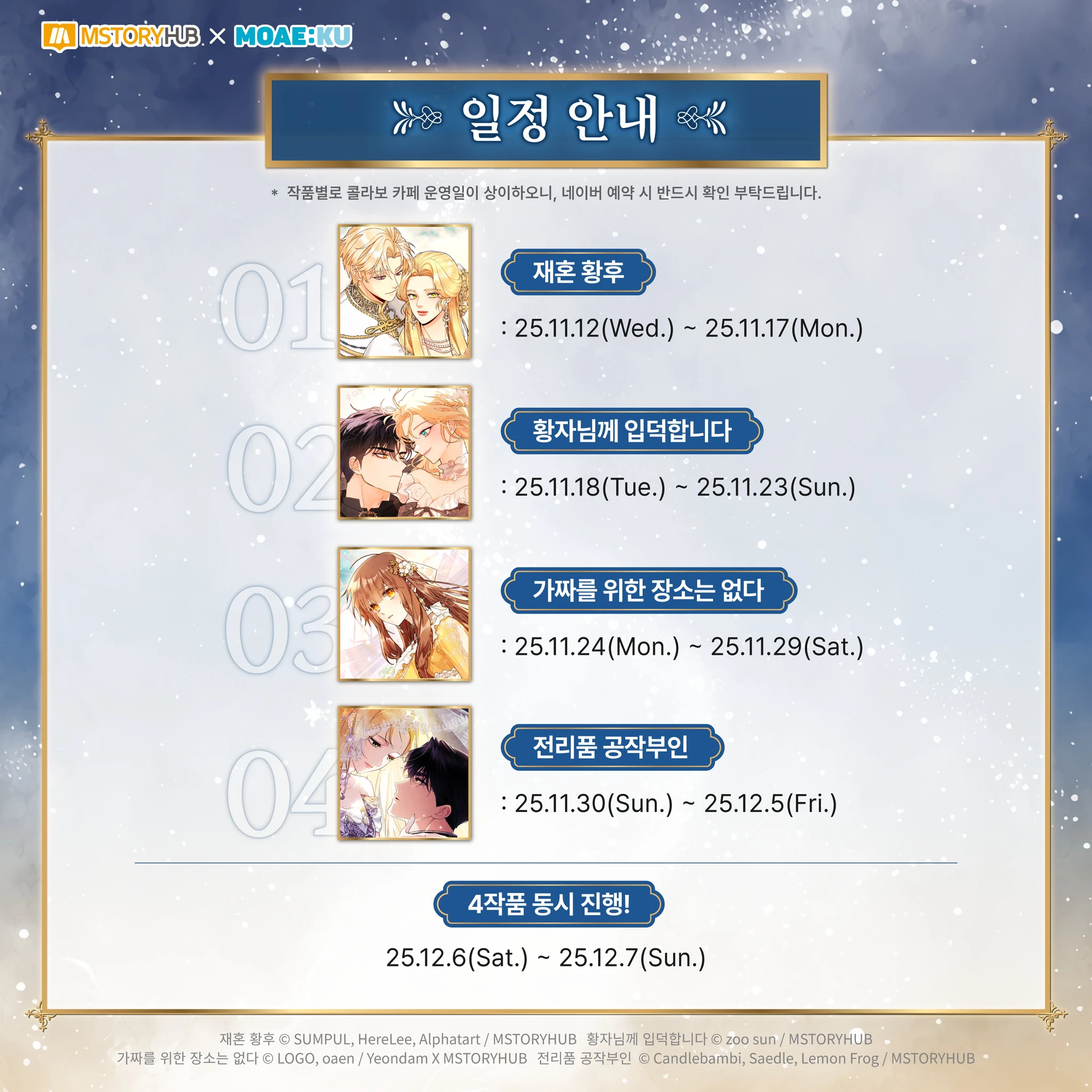 📢 일정 안내 - 11월 12일 ~ 17일 : 재혼 황후 - 11월 18일 ~ 23일 : 황자님께 입덕합니다 - 11월 24일 ~ 29일 : 가짜를 위한 장소는 없다 - 11월 30일 ~ 12월 5일 : 전리품 공작부인 - 12월 6일 ~ 7일 : 4작품 동시 진행