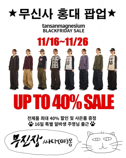 정보러블리 힙 무드가 가득한 패션 브랜드 탄산마그네슘이 블프 세일을 맞아 올해 최대 할인 팝업으로 찾아왔습니다 🖤 주영 X 탄산 콜라보 제품 뿐만 아니라 전제품을 모두 만나보실 수 있으니 지금 바로 무신사 홍대점에서 만나보세요 ✨📷 instagram @tansanmagnesium.kr
