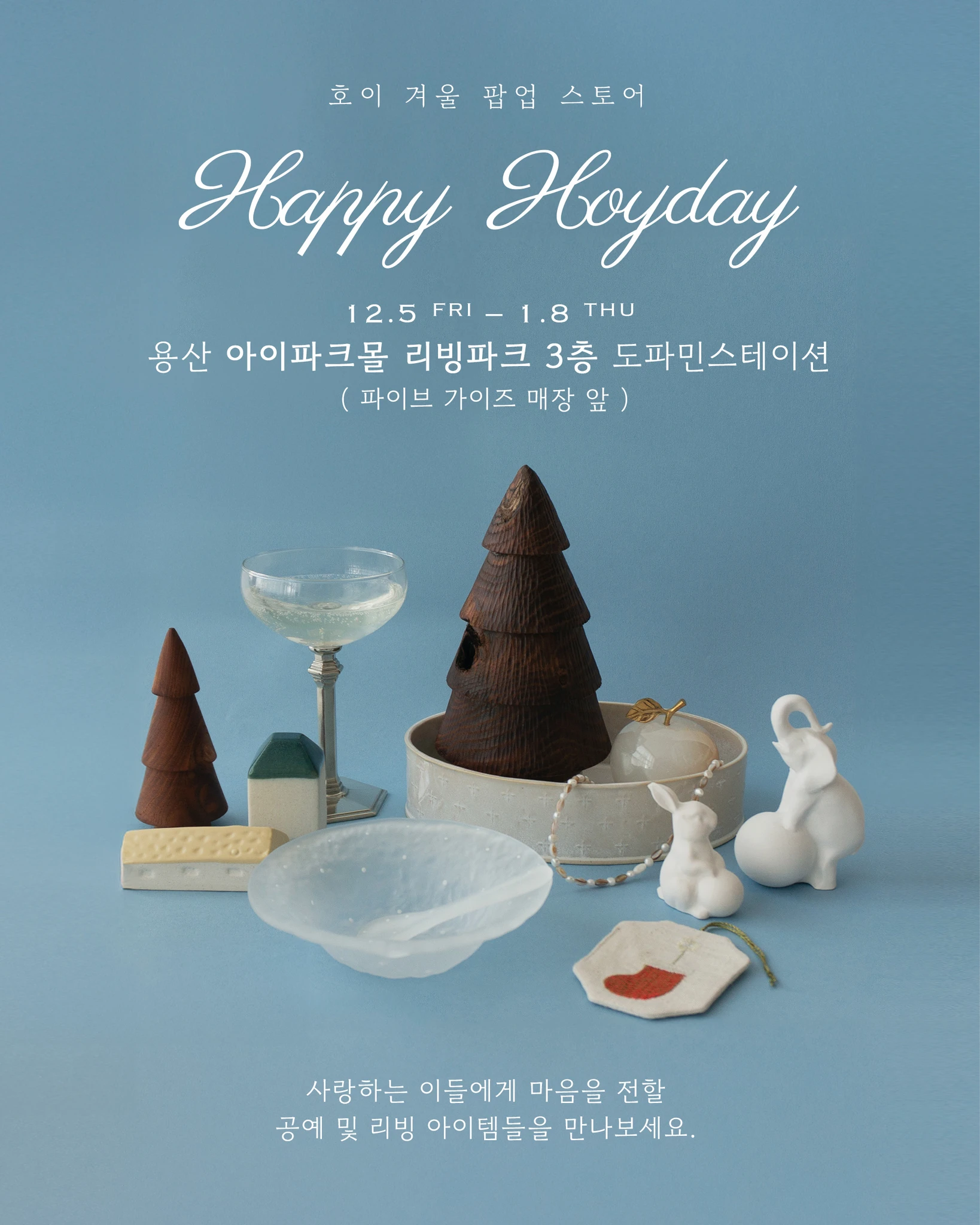 [브랜드 및 IP 설명] - 호이는 공예와 리빙 제품을 중심으로, 손으로 만든 지속 가능한 아이템을 선보이는 브랜드입니다. - 손맛과 오래 사용할수록 애착이 깊어지는 생활용품으로 입소문을 탔습니다. [팝업 설명] - 이 팝업은 직접 만지고 경험할 수 있는 공예품과 리빙 아이템을 선보이는 공간이에요. - ‘시간을 나눴던 이들과의 추억’이라는 따뜻한 테마로 꾸며졌습니다. [추천 고객] - 수공예와 친환경 라이프스타일에 관심이 많은 분들께 적합해요. - 오래 사용할 수 있는 소품이나 선물을 찾는 분들이 특별한 경험을 즐기기 좋아요. [실시간 방문자 후기] - 공예품의 정성과 디테일이 돋보인다는 평가가 많아요. - 공간 분위기에서 편안함과 따뜻함을 느꼈다는 후기가 꾸준히 올라오고 있어요. [주차 및 대중교통 정보] - 용산 아이파크몰 내 자체 주차장 이용 가능해요. - 주변 유료 주차장은 도보 5분 이내 거리에 여러 곳이 있어 편리해요. - 지하철 1호선, 4호선 용산역 3번 출구에서 도보 10분 정도 걸립니다. 이 팝업은 손으로 만든 공예품과 리빙 아이템에 담긴 시간을 느끼고, 소중한 사람에게 마음을 전하기 좋은 곳이에요. 편하게 둘러보시면서 일상의 따뜻함을 경험해 보시길 추천드려요!