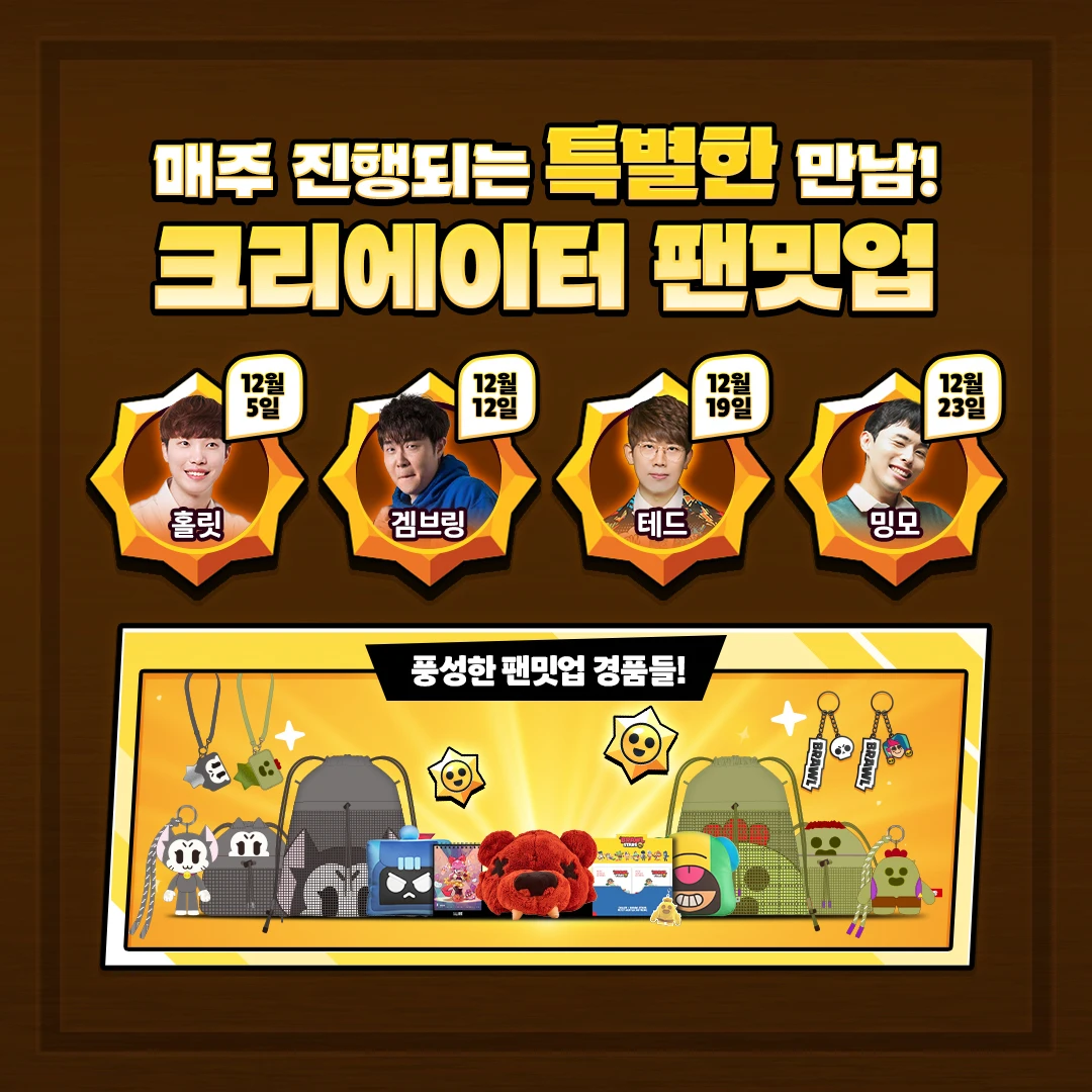 📢 크리에이터 팬밋업 기본 정보 안내 - 운영 시간 : 19시 ~ 20시 - 크리에이터 팬밋업은 사전 예약을 통해 참여할 수 있으며 네이버 플레이스 사전 예약을 통해 신청하실 수 있습니다. 📢 팬밋업 참가 크리에이터 안내 - 홀릿 : 12월 05일(금) - 겜브링 : 12월 12일(금) - 테드 : 12월 19일(금) - 밍모 : 12월 23일(화) 📢 크레에이터 별 사전 예약 오픈 일정 안내 - 홀릿 : 11월 28일(금) 10:00 - 겜브링 : 12월 05일(금) 10:00 - 테드 : 12월 12일(금) 10:00 - 밍모 : 12월 16일(화) 10:00 📢 굿즈샵 운영 일정 : 2025년 12월 01일(월) ~2026년 1월 01일(목), 매일 10시 ~ 21시30분