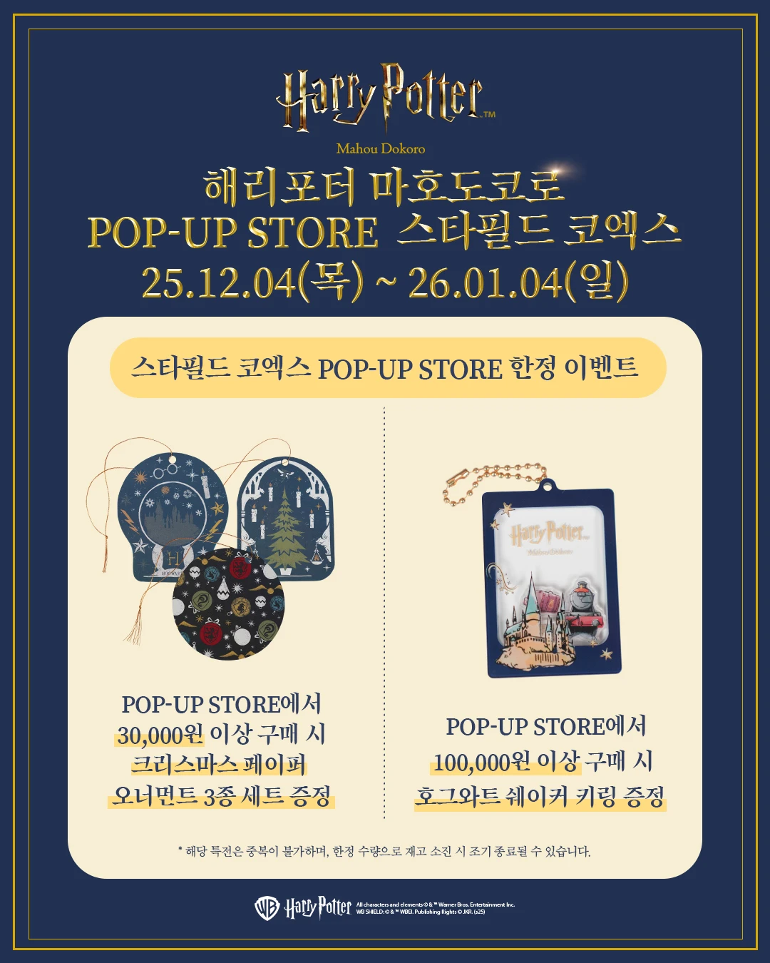 [브랜드 및 IP 설명] - 해리포터는 J.K. 롤링이 창작한 마법 판타지 소설 및 영화 시리즈로, 호그와트 마법학교와 마법 세계를 배경으로 한 이야기로 전 세계적 인기를 끌고 있어요. - 특히 해리포터 시리즈의 마법 아이템과 캐릭터들은 다양한 굿즈와 체험 공간으로 꾸준히 사랑받고 있습니다. [팝업 설명] - 겨울 시즌을 맞아 호그와트에서 영감을 받은 마법의 공간을 재현하며, 눈 내리는 마법 세계를 콘셉트로 꾸며졌어요. - 마법 굿즈 판매와 함께 포토존을 마련해 해리포터 팬들이 몰입형 겨울 체험을 즐길 수 있도록 구성했습니다. [추천 고객] - 겨울철 마법 같은 분위기와 특별한 굿즈, 사진 촬영을 즐기는 분들에게 딱 좋아요. - 가족 단위나 연인, 친구와 함께 마법 세계 속에서 연말 추억을 만들고 싶은 분들께 추천할게요. [실시간 방문자 후기] - "포토존이 정말 예뻐서 사진 찍기 좋은 공간이었어요, 겨울 느낌이 잘 살아 있었어요." - "해리포터 관련 굿즈 종류가 다양해서 선물 고르기 좋았고, 공간이 아늑해서 한참 머물렀어요." [주차 및 대중교통 정보] - 스타필드 코엑스 내 전용 주차장 이용 가능해요. - 인근 강남구청역 근처 유료 주차장 도보 약 5분 거리입니다. - 지하철 2호선 삼성역 5번 출구에서 도보 약 10분 걸려요. 마법 같은 겨울 분위기 속에서 해리포터 팬이라면 꼭 들러보면 좋을 팝업이에요. 추운 날에도 따뜻한 마법의 세계에서 특별한 경험을 즐겨보세요!