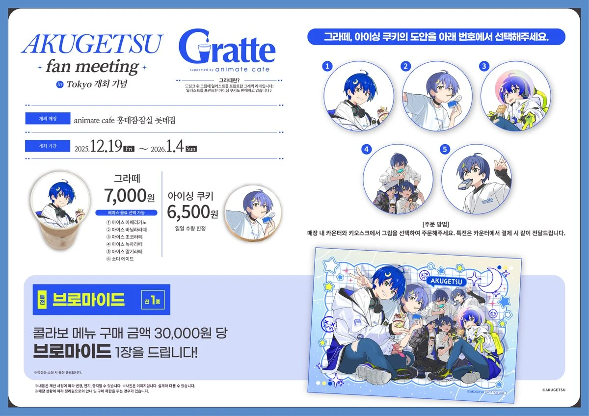 [브랜드 및 IP 설명] - 악월(아쿠게츠)은 음악 아티스트로, 팬미팅 및 앨범 발매 활동을 통해 알려졌다. - OWLBOX는 앨범 아트와 일러스트 작업을 담당한 일러스트레이터로, 악월 앨범 아트 "握 (AKU)"가 대표 작품이다. [팝업 설명] - 이번 팝업은 악월 팬미팅 도쿄 개최를 기념하며, 협업 일러스트를 중심 테마로 꾸며진다. - 특별히 OWLBOX의 신규 특전 일러스트를 만나볼 수 있는 공간으로 구성됐다. [추천 고객] - 악월 음악과 팬미팅 이벤트에 관심 있는 분들께 적합해요. - 희소성 있는 일러스트 소장과 아티스트 관련 굿즈 구매를 즐기는 분들이 좋아할 팝업입니다. [주차 및 대중교통 정보] - 애니메이트 잠실 롯데점 내 주차장 이용 가능. - 인근에 유료 주차장 다수 있으며, 도보 3~5분 거리임. - 잠실역 4번 출구에서 도보 5분 이내로 접근할 수 있어요. 이 팝업은 음악과 일러스트 팬 모두에게 특별한 경험을 선사하는 공간이니 꼭 한번 방문해 보세요!