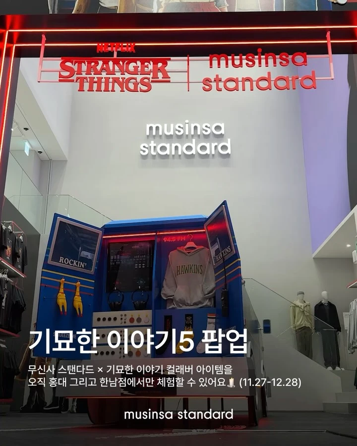 [브랜드 및 IP 설명] - 넷플릭스 오리지널 시리즈 '기묘한 이야기'는 1980~90년대 미국 소도시를 배경으로 한 SF 호러물로 큰 인기를 끌었다. - 무신사 스탠다드는 스트리트 캐주얼 브랜드로, 합리적 가격과 감각적인 디자인으로 사랑받고 있다. [팝업 설명] - 이번 팝업은 기묘한 이야기의 상징적인 그래픽과 오브제를 무신사 스탠다드 스타일의 공간에 구현했다. - 용산 무신사 스탠다드 한남점에서 넷플릭스 시리즈 팬들과 패션·엔터테인먼트 팬들을 위한 특색 있는 체험 공간을 제공한다. [추천 고객] - 넷플릭스 드라마 팬 중 기묘한 이야기 세계관을 실제 공간에서 느끼고 싶은 분들께 잘 맞아요. - 무신사 스탠다드 스타일과 기묘한 이야기의 시각적 요소를 함께 즐기려는 패션과 콘텐츠 체험을 좋아하는 분께 추천해요. [실시간 방문자 후기] - 기묘한 이야기 관련 그래픽과 소품들이 인상적이어서 사진 찍기 좋은 공간이라는 평이 많았어요. - 무신사 스탠다드 한남점과 협업해 스타일리시한 분위기가 잘 느껴진다는 방문객 반응이 있었습니다. [주차 및 대중교통 정보] - 무신사 스탠다드 한남점 건물 내 주차장 이용 가능해요. - 인근에 유료 주차장도 여러 곳 있으며, 도보 5분 내외 구간에 위치해요. - 가장 가까운 지하철역은 용산역이며, 1번 출구에서 도보 약 10분 거리입니다. 기묘한 이야기 팬들과 패션을 사랑하는 분들께 이 팝업은 딱 맞는 공간일 거예요. 차분하면서도 몰입감 있는 경험을 원하시면 한 번 들러보시길 추천드려요!