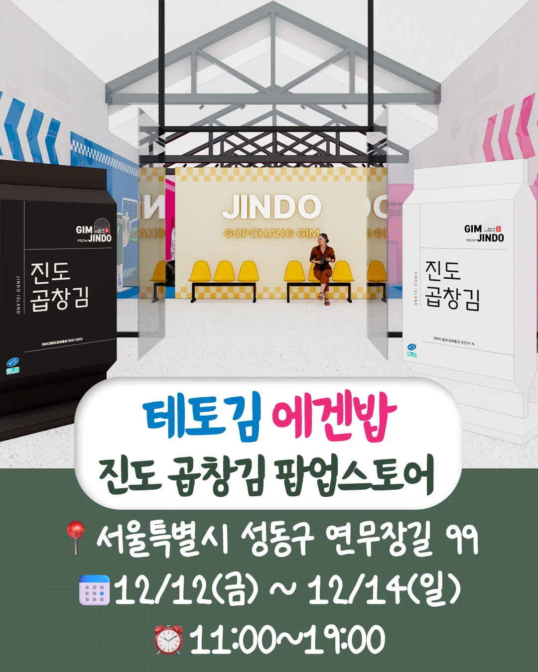 정보테토김&에겐밥 서울에 상륙💪 진도 곱창김 팝업스토어가 성수에 떴습니다! 컨셉은 신박하고, 체험은 더 신박한 그곳, 간단한 체험만 참여해도 리워드 증정까지✨ 진도 곱창김의 건강함 그 자체를 온 몸으로 느껴보세요!