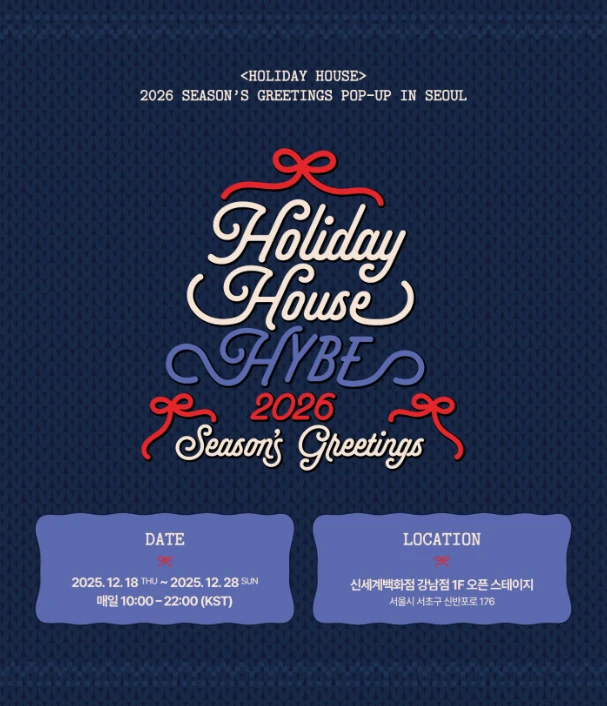 📢 아티스트 : SEVENTEEN, TOMORROW X TOGETHER, ENHYPEN, LE SSERAFIM, &TEAM, BOYNEXTDOOR, TWS, KATSEYE, CORTIS 📢 사전 예약 - 사전 예약 사이트 : 네이버 예약 - 사전 예약 오픈 일정 : 2025. 12. 15 (MON) 18:00 (KST) 📢 방문 안내 : 2026 SEASON'S GREETINGS POP-UP은 ‘사전 예약’ 또는 ‘현장 예약’으로 입장이 가능합니다. 📢 1회차 본인확인 시간은 10:00~10:30 (KST)으로 진행되며 1회차 입장은 10:30 (KST) 부터 가능합니다.