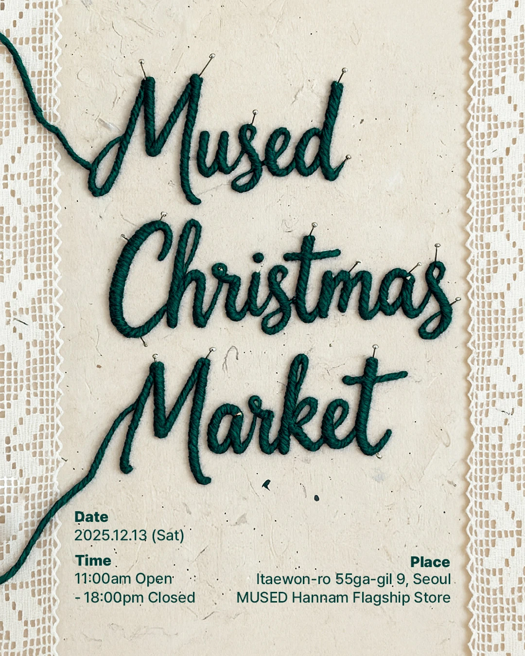 정보뮤제드 한남 쇼룸에서 열리는 크리스마스 마켓에 여러분을 초대합니다 ✨ 15개의 브랜드와 함께 준비한 다양한 패션 아이템, 올겨울 가장 설레는 순간을 뮤제드에서 만나보세요 🎄❄📷 instagram @mused_official