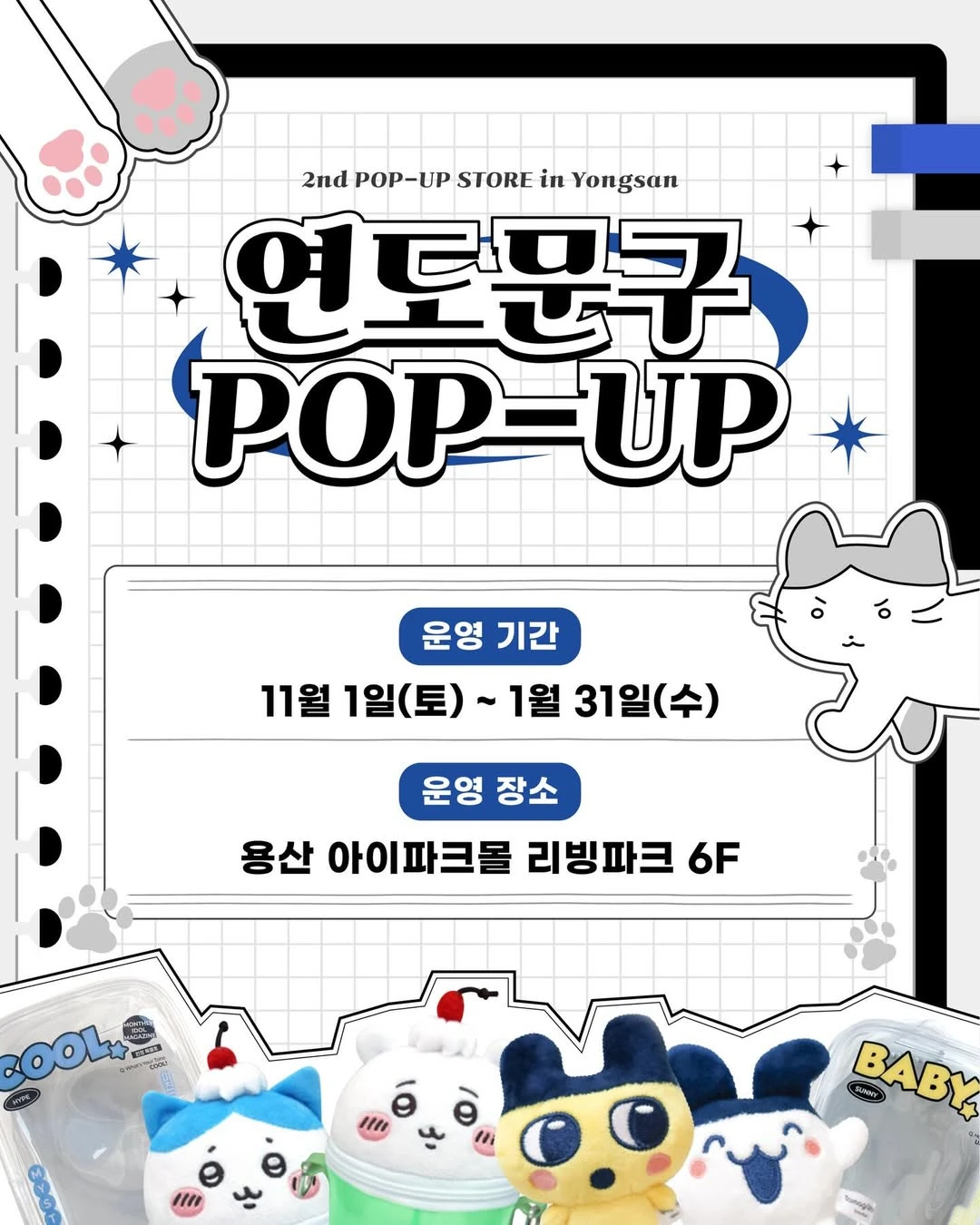 [브랜드 및 IP 설명] - 연도문구는 귀엽고 예쁜 문구류를 제작하는 한국 브랜드로, 다마고치 등 오리지널 캐릭터 상품이 유명하다. - 일상에 작은 행운과 즐거움을 주는 디자인과 실용성을 가진 문구 아이템으로 인기를 끌고 있다. [팝업 설명] - 이 팝업은 연도문구의 인기 캐릭터들과 신상품들이 함께 전시되는 마법상점 콘셉트의 공간이에요. - 귀여운 문구 아이템과 소소한 일상에 행운을 더하는 아이템들을 한자리에서 체험하고 구매할 수 있답니다. [추천 고객] - 독특한 디자인 문구와 캐릭터 상품을 좋아하는 분들에게 잘 어울려요. - 일상의 소소한 즐거움과 행운을 주는 아이템을 발견하고 싶은 분께 추천해요. [실시간 방문자 후기] - 다마고치와 담곰이 캐릭터 상품이 실제로 귀엽고 다양해서 만족스럽다는 평이 많아요. - 마법상점 같은 공간 분위기와 포토존이 사진 찍기 좋은 요소로 호평받고 있어요. [주차 및 대중교통 정보] - 아이파크몰 용산점 내 주차장 이용 가능해요. - 인근에 유료 주차장이 다수 있으며, 도보 3~5분 거리입니다. - 가장 가까운 지하철역은 용산역, 1번 출구에서 도보 약 7분 거리예요. 조금 특별한 문구 아이템과 귀여운 캐릭터가 모인 마법상점을 직접 만나보고 싶다면 이 팝업이 딱이겠네요!