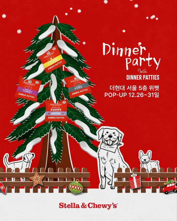 정보반려동물을 위한 브랜드 스텔라앤츄이스가 팝업으로 찾아왔습니다 ✨ 디너패티 크리스마스 트리와 함께 우리 아이들이 좋아하는 다양한 제품들을 직접 만나보고, 연말 특별 구성도 현장에서 확인하실 수 있어요 🐶❤️ 반려 아이들과 함께 따뜻한 연말 산책처럼 들러보세요 🎁📷 instagram @stellaandchewyskorea