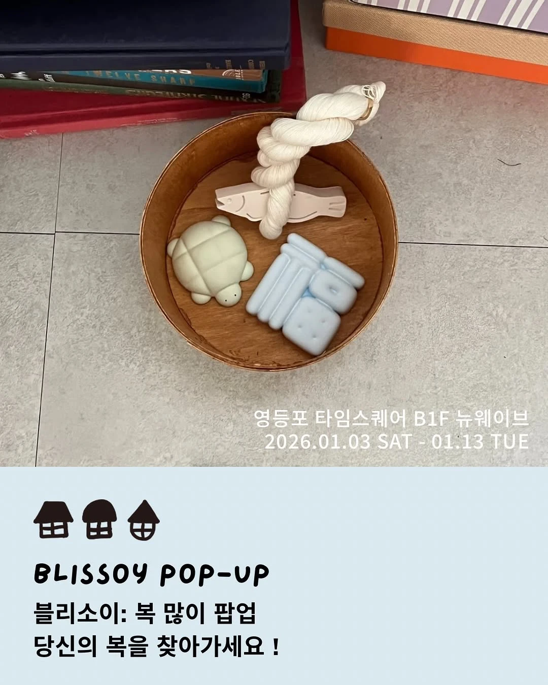 정보블리소이가 준비한 복 많이 팝업이 영등포 타임스퀘어에서 열립니다 🩵🍀 블리소이 팝업에 방문하면 2026년의 시작을 기분 좋게 열어줄 행운 가득한 아이템들을 만나볼 수 있어요! 블리소이가 전하는 따뜻한 복과 함께 행운을 픽업해보세요 ✨📷 instagram @blissoy.zip