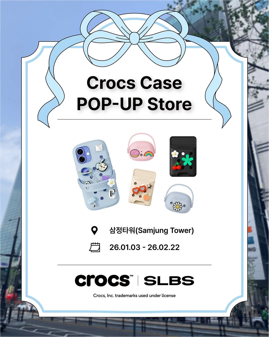 정보크록스 케이스 팝업에 여러분을 초대합니다 🎀 더현대 서울과 신세계 센텀시티점에서 사랑받았던 아이폰, 갤럭시, 에어팟, 맥세이프 월렛 모든 라인업을 삼정타워에서 만나보실 수 있어요. 꾸미는 재미가 한가득한 크록스 케이스 팝업에서 나만의 스타일로 커스터마이징해보세요 ✨📷 instagram @by.slbs