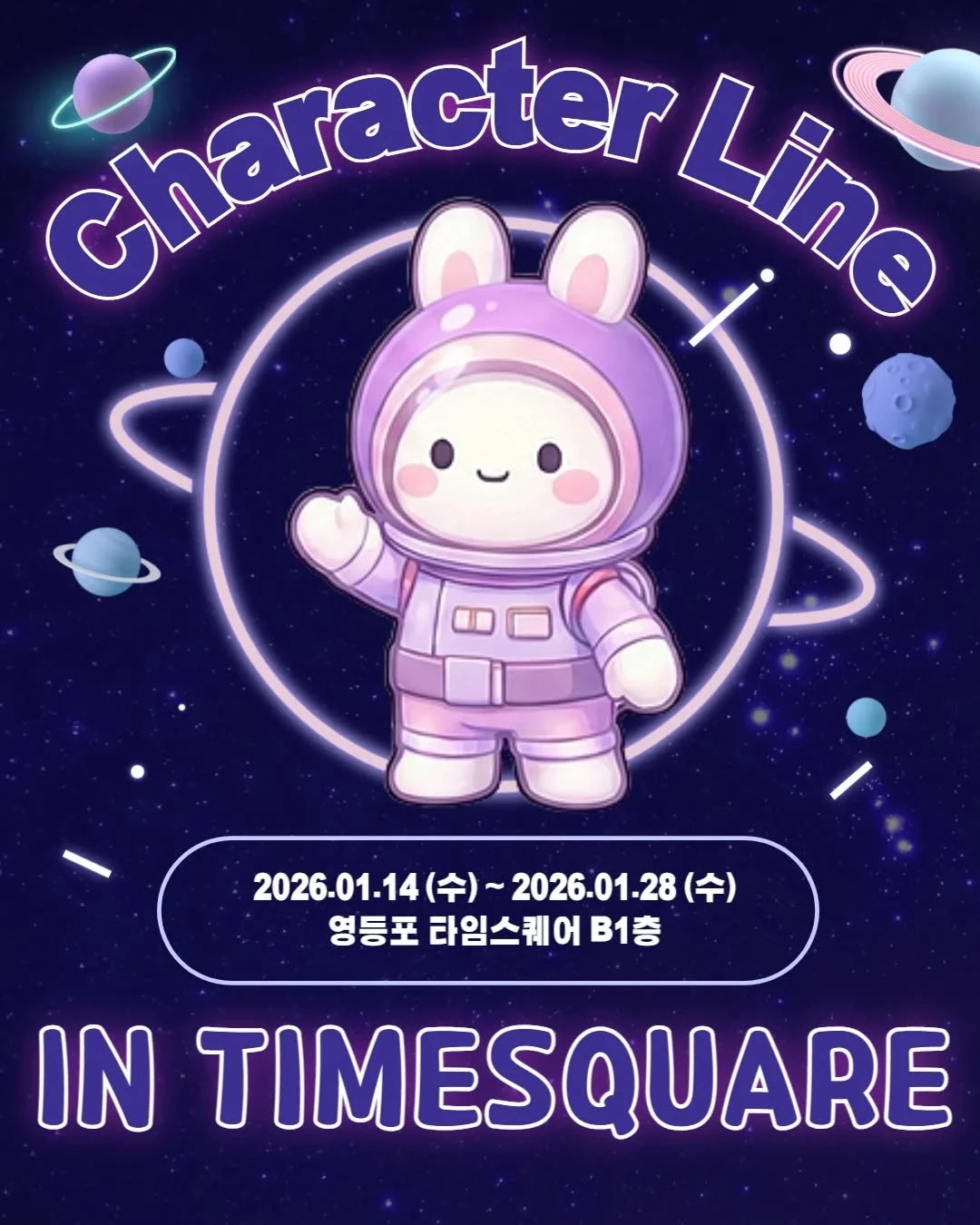 [브랜드 및 IP 설명] - 캐릭터라인은 다양한 캐릭터 굿즈를 선보이며 인기를 얻은 브랜드로, 보라색 우주토끼 캐릭터가 대표 아이콘이다. - 귀여운 우주 테마 캐릭터 상품으로 특히 젊은 층과 캐릭터 팬 사이에서 인지도가 높다. [팝업 설명] - 우주 콘셉트 공간에서 보라색 우주토끼 대원을 중심으로 꾸며진 체험형 팝업이다. - 캐릭터 굿즈 판매와 함께 포토존 체험이 마련되어 방문객이 추억을 남길 수 있다. [추천 고객] - 독특한 우주 테마 캐릭터와 굿즈를 좋아하는 캐릭터 팬과 굿즈 수집 애호가에게 적합해요. - 예쁘고 귀여운 포토존에서 특별한 사진을 남기고 싶은 SNS 사진 애호가에게도 딱이에요. [실시간 방문자 후기] - 보라색 우주토끼 캐릭터와 우주 테마 공간이 귀여워서 체험하는 재미가 있다고 좋아해요. - 포토존이 잘 꾸며져 있어 사진 찍기 좋고, 굿즈 종류가 다양해 쇼핑 만족도가 높다는 리뷰가 많아요. [주차 및 대중교통 정보] - 팝업 장소인 타임스퀘어 지하 1층 내 주차장 이용 가능해요. - 인근에 유료 주차장이 있고 도보 3~5분 거리에 위치해요. - 가장 가까운 지하철역은 영등포역이며, 1번 출구에서 도보 약 7분 거리예요. 캐릭터라인 팝업에서 귀여운 우주 토끼와 함께 특별한 우주 여행을 떠나보세요. 캐릭터 굿즈도 사고 사진도 찍으며 재미있는 시간을 보내기 딱 좋답니다!