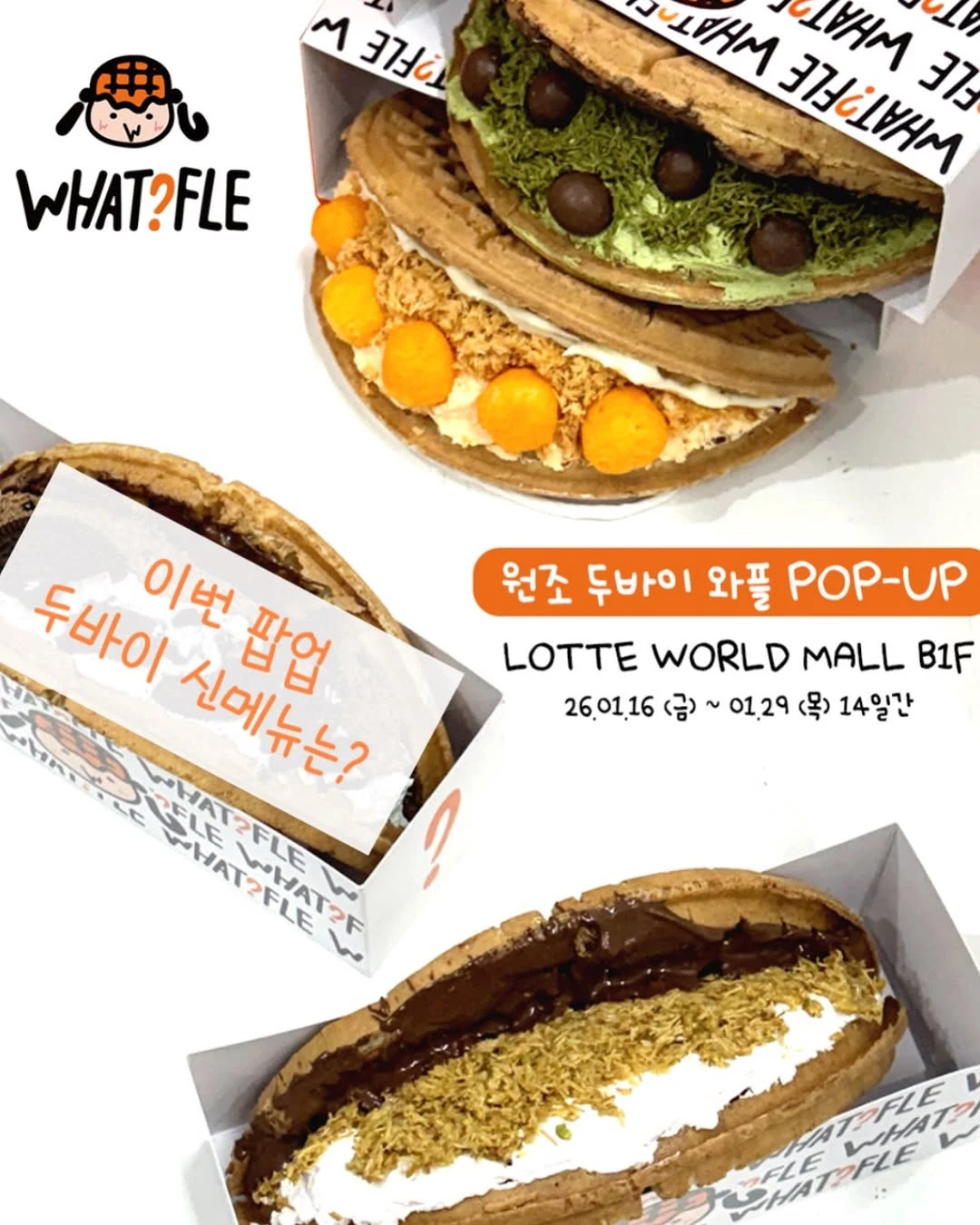 잠실, 왓플, whatffle 팝업, 롯데월드몰, 잠실 팝업, 두바이 와플, 두바이 쫀득 쿠키, 두쫀쿠, 디저트, F&B