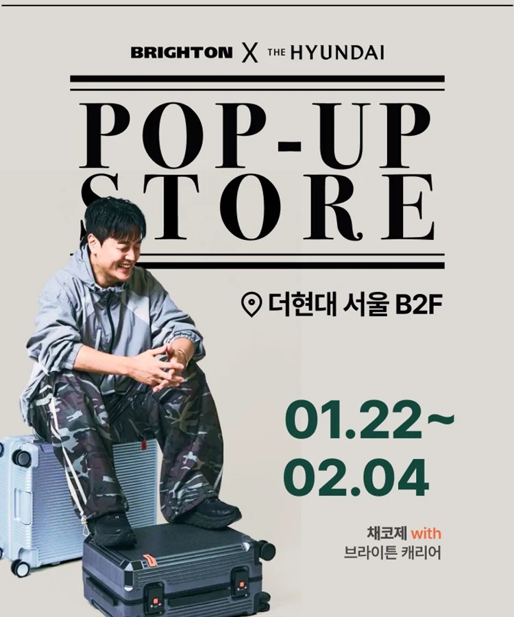 정보여행용 캐리어 브랜드 브라이튼의 팝업스토어가 더현대 서울에서 열려요 ✨ 다양한 캐리어와 여행용품을 초특가 혜택으로 만나볼 수 있고, 현장에서 직접 체험해보세요 🧳💫📢 1월 25일(일) 오후 2시, 브라이튼 앰버서더 유튜버 채코제가 팝업스토어에 방문합니다. 📷 instagram @brighton.mall_official