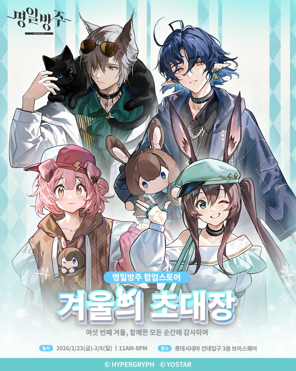 정보명일방주의 2026년 첫 오프라인 팝업스토어 〈겨울의 초대장〉이 서울 건대입구에서 열려요 🤍 체험존부터 전시존, 굿즈존, 콜라보 카페까지 다채롭게 구성된 공간에서 명일방주의 여정을 천천히 되돌아보고, 한정 굿즈와 다양한 체험 콘텐츠도 함께 즐겨보세요 ✨📢 본 팝업은 사전 예약 후 입장 가능한 행사입니다. 📢 콜라보 카페 이용은 별도 예약이 필요합니다. 📷 X @ArknightsKorea