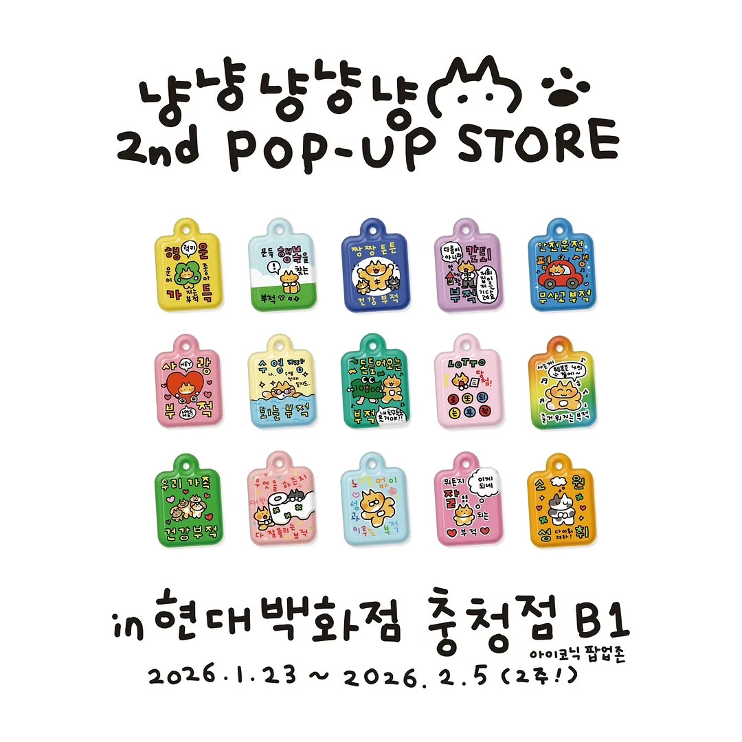 정보귀여운 고양이 굿즈 팝업이 현대백화점 청주에 찾아왔습니다 ꜀(^. .^꜀ )꜆੭ 부적 키링을 비롯한 다양한 고양이 굿즈와 함께, 냥냥냥냥냥만의 아기자기한 세계관을 현장에서 직접 만나보세요 🙌🏻📷 instagram @ju_s0621