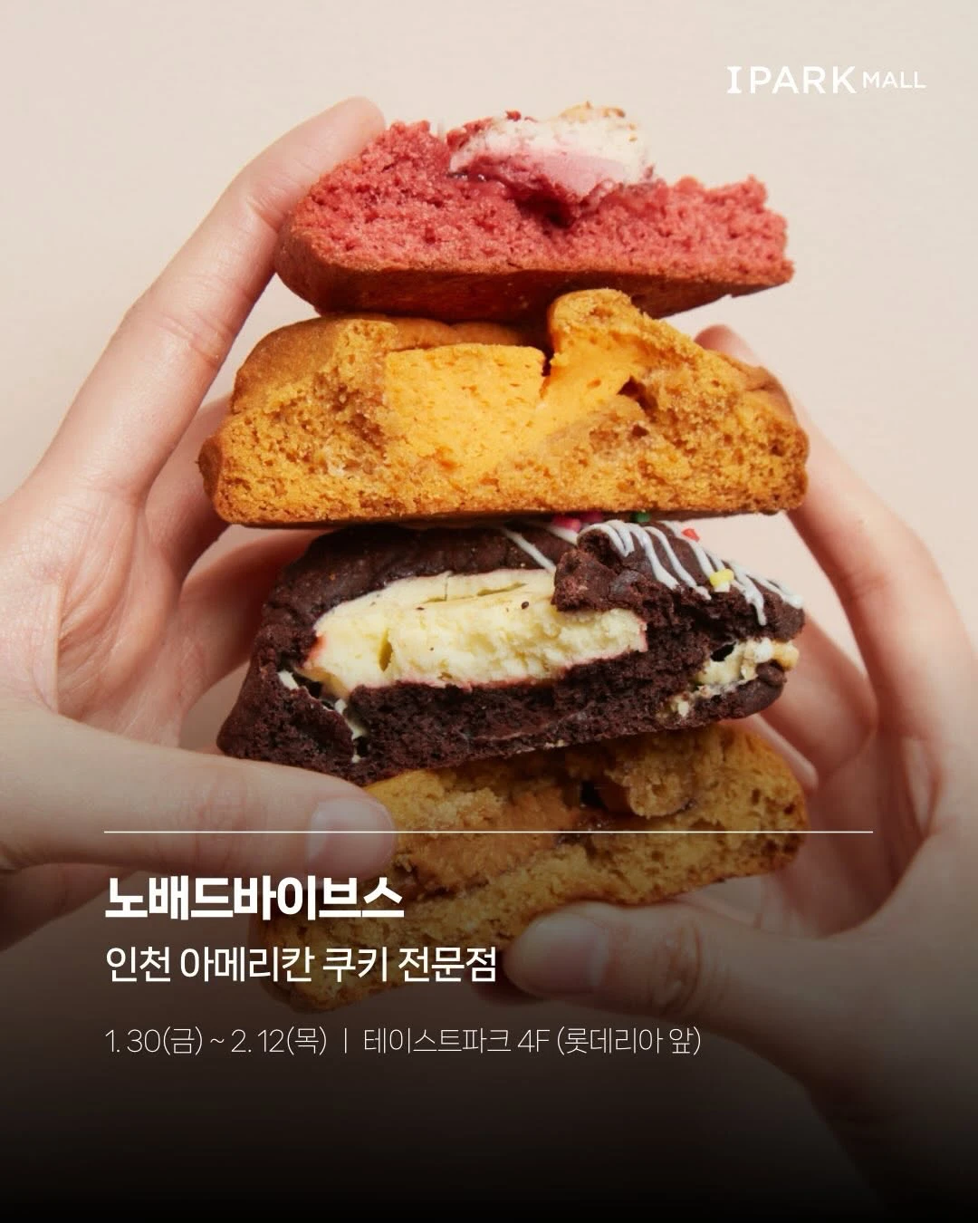 정보인천에서 시작한 아메리칸 어글리 쿠키 전문 브랜드, 노배드바이브스 팝업이 오픈했어요 🍪✨ 진한 풍미와 꾸덕한 식감을 꽉 담은 쿠키들을 직접 만나보세요 🤎📷 instagram @iparkmall