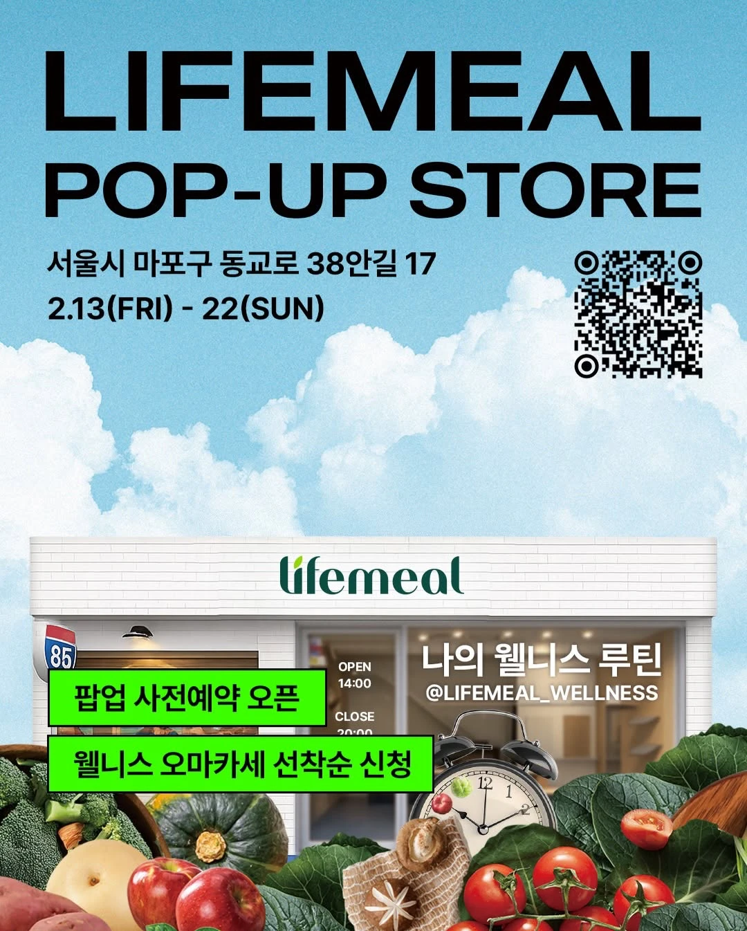 정보라이프밀이 홍대에서 웰니스를 직접 경험해볼 수 있는 팝업스토어를 운영해요 🌿✨ ‘나에게 맞는 웰니스 루틴 찾기’를 주제로 WBTI 진단부터 맞춤 음료 체험, 웰니스 오마카세까지 모두 만나보세요 🙌🏻📢 설날 및 공휴일 정상 운영합니다. 📢 웰니스 오마카세는 100% 사전 예약제로 운영됩니다.