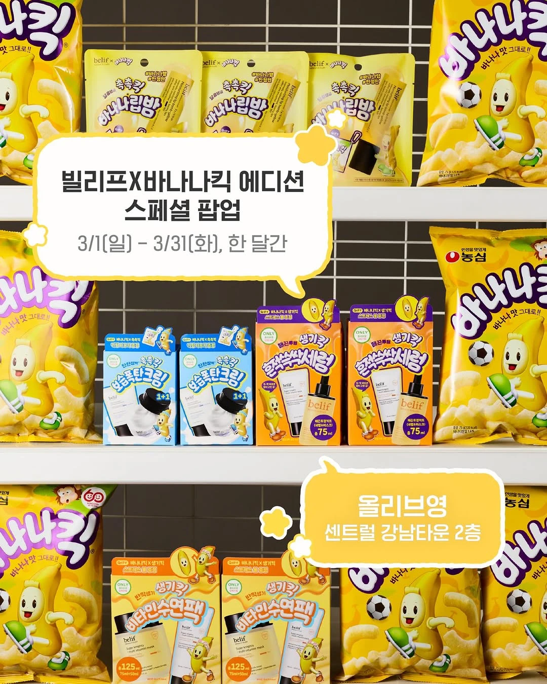 [브랜드 및 IP 설명] - 빌리프는 자연 유래 성분을 강조하는 한국의 뷰티 브랜드로, 수분크림과 마스크팩 같은 히트 상품으로 알려졌어요. - 바나나킥은 농심에서 만든 바나나 맛 스낵으로, 어린이부터 어른까지 사랑받는 대표 과자입니다. [팝업 설명] - 빌리프와 바나나킥의 달콤하고 귀여운 콜라보레이션 콘셉트로 꾸며진 팝업이에요. - 귀여운 캐릭터 포토존과 콜라보 제품 체험 공간으로 구성되어 방문객 참여를 유도합니다. [추천 고객] - 귀여운 캐릭터와 색감이 돋보이는 SNS 사진 찍기를 좋아하는 분에게 적합해요. - 뷰티 신제품과 한정 콜라보 굿즈 체험에 관심 많고 달콤한 분위기를 즐기고 싶은 분께 잘 어울려요. [실시간 방문자 후기] - "포토존에서 찍은 사진이 정말 사랑스럽고 분위기가 즐거워요." - "콜라보 뷰티 제품을 직접 써보니 색다른 경험이었고 달콤한 콘셉트가 마음에 들었어요." [주차 및 대중교통 정보] - 올리브영 센트럴 강남타운 건물 내 주차장 이용 가능해요. - 인근에 강남역 유료 주차장이 있어 도보 5분 내 접근 가능합니다. - 가장 가까운 지하철역은 강남역, 11번 출구에서 도보 5분 거리예요. 달콤하고 귀여운 빌리프 X 바나나킥 콜라보 팝업, 사진 찍기 좋고 제품 체험도 재밌으니 강남에 가시면 꼭 들러보세요!