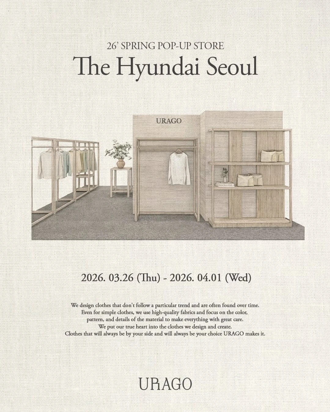 여의도, 유라고, URAGO 팝업, 26’ SPRING POP-UP STORE, 더현대 서울, 여의도 팝업, 서울 팝업, 패션, 26SS, 럭키드로우