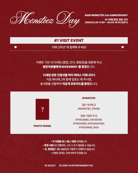 📢 본 이벤트는 더세임 합정 / 명동 / 인사점에서 동시 진행됩니다 📢 합정점은 4월 4일(토) 이벤트가 진행되지 않습니다 📢 멤버십 이벤트 참여 시 신분증 + BABYMONSTER Weverse Membership 화면 확인이 필요합니다 📢 일부 이벤트는 Weverse Membership 가입자 대상 참여 가능합니다